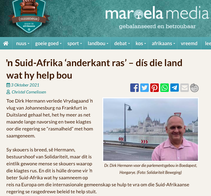 A high level delegation from the Solidarity Movement (SM) and an affiliate organisation paid a follow-up visit to Hungary at the end of September / beginning October of 2021. Solidarity Movement website: https://beweging.co.za/en/